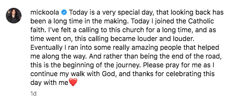 “Hoy es un día muy especial, que visto en retrospectiva, ha tardado mucho en llegar.” Hoy me uní a la fe católica”, escribió en una publicación de Instagram. “He sentido una vocación por esta Iglesia desde hace mucho tiempo, y a medida que pasaba el tiempo, esta vocación se hacía más y más fuerte.”